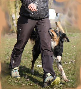 Zusätzlich wird geübt, dass der Hund sich gegenüber Menschen, anderen Hunden sowie im Verkehr gleichgültig verhält.